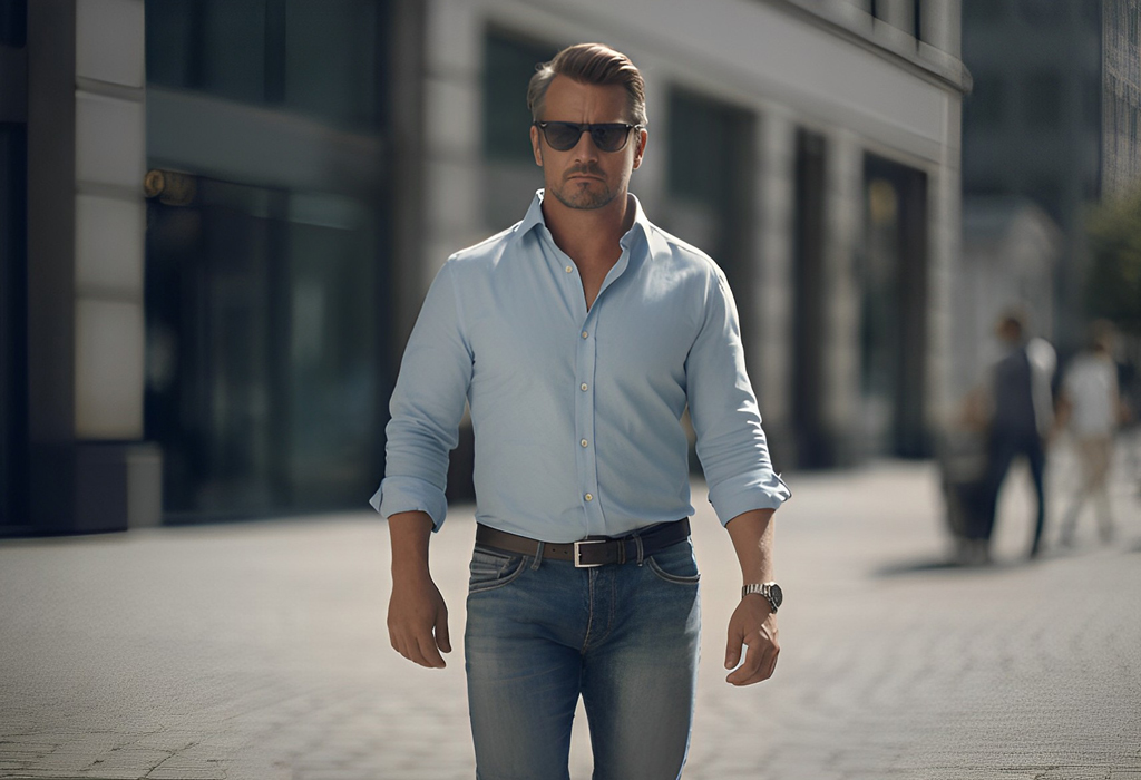 That means big cuffs on your jeans and pants are a no. So are wide belts with large buckles. Wear a slim belt of a similar color to your pants. Even better, go beltless and try braces or side adjusters instead.